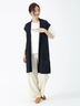 ポケット口やヘムラインのラメを効かせたタック柄と、ポケットの刺しゅうロゴをアクセントにしたラペル付きロングジレ。
