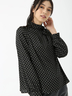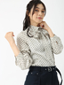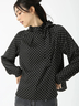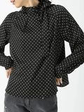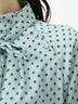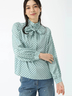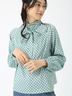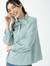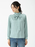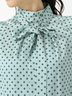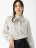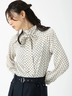 エレガントなスタイルにマッチする配色パイピングがアクセントのボウタイミドルネックブラウス。