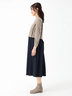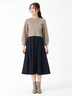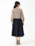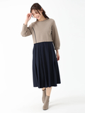 スカート部分に柔らかなタフタをドッキングした異素材MIXワンピースは、1枚で着映えるデザイン。ショートブーツを合わせて秋らしい装いに。