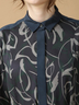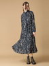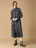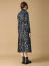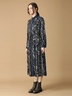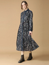 繊細なジョーゼット素材を使用し、深みのあるネイビーにグリーンが映えるシックなプリントワンピース。