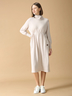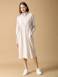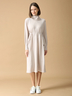 オフタートルが優しく顔まわりを包み、フロントのゴム紐でギャザーを寄せてウエスト調整も可能。