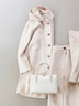 <Pale-tone Natural>質感の良さが魅力のウール素材を使用し、ハイブリッドにデザインしたアイテムでコーディネートするナチュラル&フェミニンスタイル。ペールトーンのワントーンコーディで女性らしさを演出しながら、意匠アイテムとの組み合わせで優しくナチュラルな印象に仕上げています。