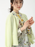 大きさの異なるフラワー柄をドッキングし、スカーフ調の配色とボウタイ見えの衿で意匠感を高めています。