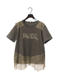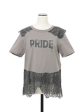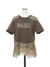 ロゴプリントにレース使いを重ねたデザインが印象的なカットソー。
